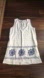 This elegant dress showcases a beautiful white base adorned with intricate blue embroidery along the neckline and hem. Made from a light, breathable fabric, it offers a comfortable fit perfect for warm weather. The sleeveless design and delicate detailing make it a versatile piece for casual outings or special occasions.