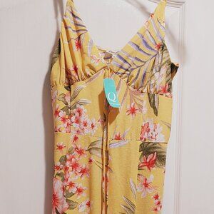 A bright yellow floral dress with spaghetti straps and a midi length. It is designed for women in size L, featuring a sleeveless style and a flower theme. The dress is accented with strap details, making it perfect for a sunny day or a special occasion. The brand Camellia is known for its elegant and feminine designs, ensuring that this dress will be both stylish and comfortable for any wearer.