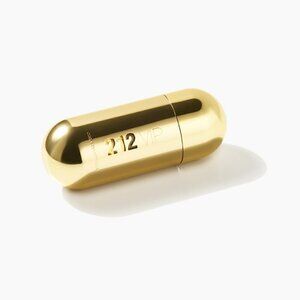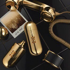 A modern icon of youth, the 212 VIP fragrance is housed in a matte gold bottle with a metallic, round design.