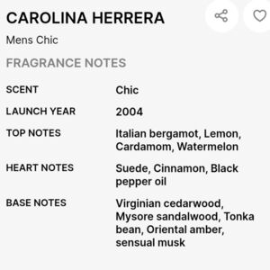 Introducing the Carolina Herrera Men's Chic EDT Spray, a unique and compelling fragrance crafted specifically for the modern man. Immerse yourself in its intriguing blend of top notes including Italian bergamot, lemon, cardamom, and watermelon, each contributing to a refreshing and invigorating scent that's perfect for day-to-day wear.