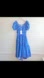 Caroline Constas blue dress featuring white polka dots print, elasticized shoulder, puff sleeves, two concealed pockets at hips, and decorative buttons at front. Can be styled as an off-shoulder dress.