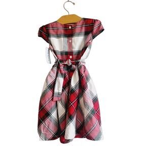New with tags Carter's red and green plaid dress size 5T. Lined. Buttons down back. Ribbon tie around dress. Also available in 4T.