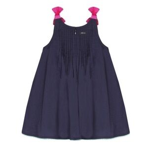 A stylish percale sundress with pleated fabric. Pink bow detail on the sleeves. Dotted Swiss fabric. 3D leaves on the fest. Fastened by a button on teardrop opening at the back. Teal braid on the hemline.