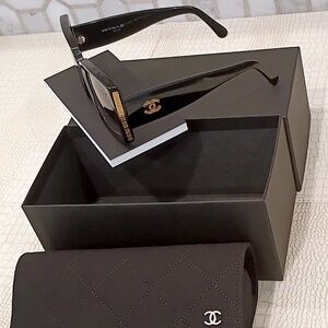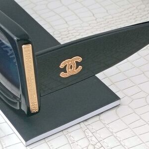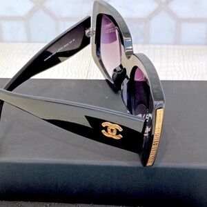 Chanel, Black/Gold, Grey Gradient Lens RECTANGLE SUNGLASSES.
