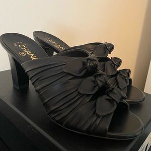 New Chanel black lambskin mules with bows. Euro size 40.5. Comes with box and two dust bags. From season 18A. Purchased at Neiman Marcus. Some light marks on bottom from trying on in my house on hardwood floors. Never worn outside.