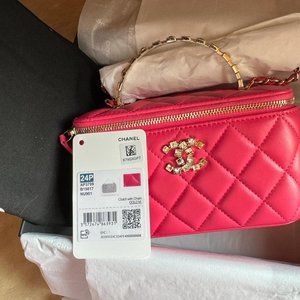 Brand New, never used. Limited Edition Chanel Clutch with Chain in Fuchsia Color with goldtone hardware. The bag has a zip top with handle and a chain. The inside is pretty big that can easily fit your phone or any other important essentials. It also has a large mirror and a few compartments.