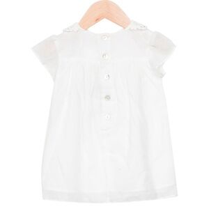 Girls' white Charabia cap sleeve draped dress with lace-trimmed neckline and button closures at center back. Machine washable.