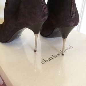 Stunning leather boots in a deep brown suede. New in Box! Zips down the full length in back of boot. Silver tipped stiletto heels. Gorgeous and rich. Heel is 4" / shaft is 15" long. Brand new!