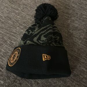 The Chelsea FC Swirl Pom Knit features an embroidered Chelsea logo at the front cuff with the New Era flag at the left-wear side and a one-time removable pom at the top.