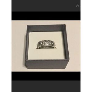 This beautiful band ring features 3/4 carats of round cut pave set AAA quality simulated diamond gemstones. It is done with 2.4 g of .925 solid sterling silver and is stamped for authenticity. It has then been layered in platinum for a lifetime of shine and durability. It is size 8.