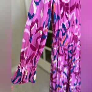 Make a statement in this vibrant Chico’s dress featuring an abstract floral-inspired print in shades of pink, purple, and blue. Designed with a flattering tiered silhouette, this dress includes a button-front bodice, V-neckline, and long sleeves with stylish pleated cuffs. Lightweight and breezy, it’s perfect for spring, summer, or vacation wear.