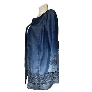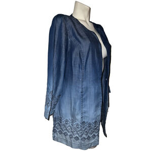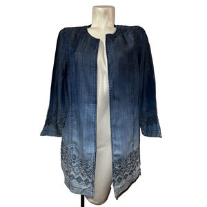 New Chico's Jacket L (2) Chambray Embroidered Open Front Royal Dip-Dyed Duster