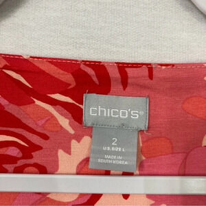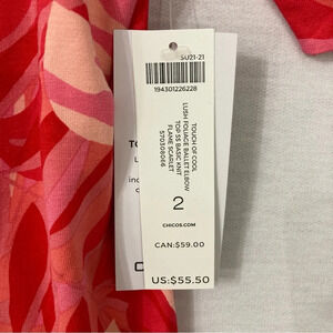 New Chico's Red Tropical Leaf Print Crew Neck Stretch Short Sleeve Top Large / 2