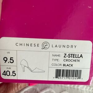 New! Sleek black heels with a pointed toe by Chinese Laundry. Elegant design for versatile wear. Comfortable and stylish. Crochet fabric front. 4 inch heels. New! Does not include original box. Z-Stella style. Smoke free home. Women’s size 9.5