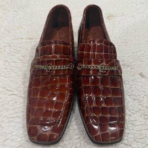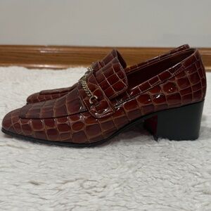 Christian Louboutin “MJ” heeled loafers in rich Acajou croc-embossed leather. Crafted in Italy with timeless detail and a signature red sole, these loafers combine luxury and edge with their notched vamp, gold-tone logo chain, and sleek 50mm block heel.