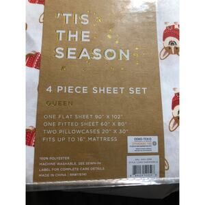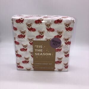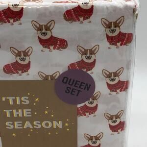 New 4pc Tis The Season Corgi wearing a red fair isle sweater queen size sheet set. Includes 1 flat sheet, 1 fitted sheet and 2 standard pillow cases.