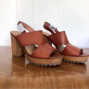 New Chunky Heel Sandel 9.5 Stacked Block Cognac Brown Strap Comfort Retro
