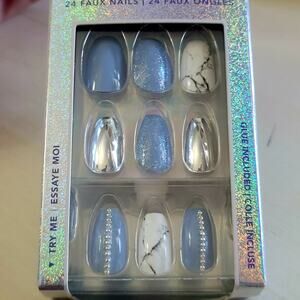 New Claire’s Vegan Glue-On Nails, 24pc Coffin Style, Periwinkle, Silver, Marble