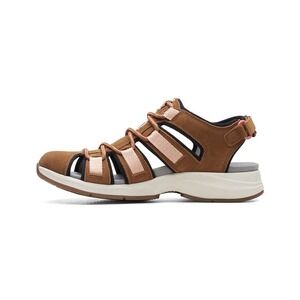 Clarks Dark Women's Tan Solan Sail Sandal - Size 7.5, 8, 8.5, 9. Unique webbing and side cutouts create an athleisure-inspired look on these lightweight and breathable closed-toe sandals boasting a cushioned footbed for all-day comfort. Hook and loop closure. Contoured, cushioned footbed. Man-made upper. Textile lining. Man-made sole. Imported.