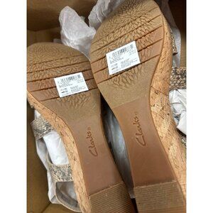 New in original box Clarks Women's, Elleri Rae Sandals rose way beige metallic cork wedges 12m US women’s size