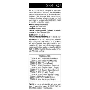 Timeless, obviously handwrought beauties. The kids' garment on the right has 6 possible charted centres based on quilt blocks (House, Nine Patch, Shoo Fly, Star, Log Cabin, and Pinwheel-- you can see some of them at the lower right in the big picture); the adult garment on left is just perfect as is, and would be a fantastic way to use up scraps (thus following the real quilting tradition). The kids' sweater is in sizes 2 - 8, and you can use Montera or La Gran instead of London Tweed. For the adult garment, try Renaissance or Portland Tweed.