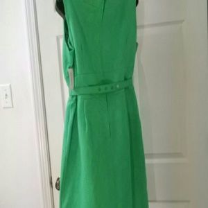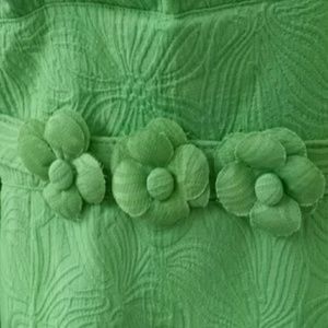 Very Vintage looking. Sleeve less floral pattern green dress w/belt. Belt is accented with three flowers. Thick material and fully lined. Great for a wedding or any dressy event. Mint condition.