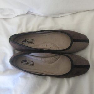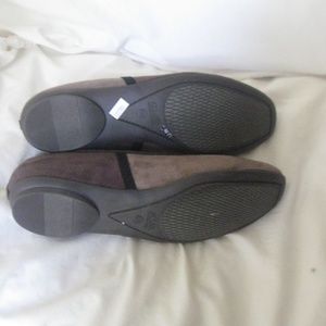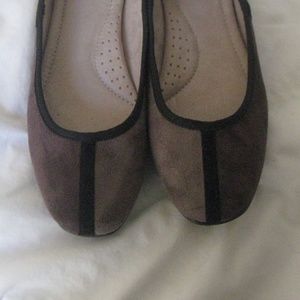 Brown and black color suede feel block flats. Stylish shoes have cushioned insole. Neutral colored flats are NWOT guaranteed. Elegant, comfortable shoes for many occasions.