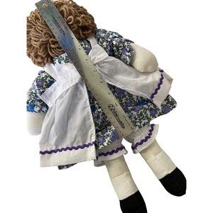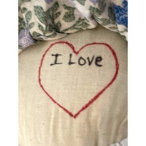 Soft handmade fabric rag doll. Her dress, apron and bloomers are also handmade and can be removed for laundering if needed. Her face is hand painted so there are no buttons or possible choking hazards. Her hair is made with brown yarn and her dress is sewn with lavender and blue floral fabric. She has a heart drawn on her chest with "I Love" written inside, Leave as is or add a name to personalize. She is approximately 19" long. This doll is new.