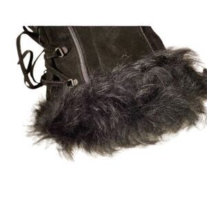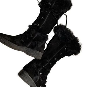This is a new and perfect pair of coach tall supple leather black lace up boots with the fur trim. Fully lined in the softest leather imaginable. Nonskid soul. A tall boot. Absolutely to die for. Do not hesitate to pick up these boots. Made in Italy. Size 9 1/2. These boots are exceptional in every way.