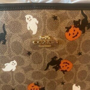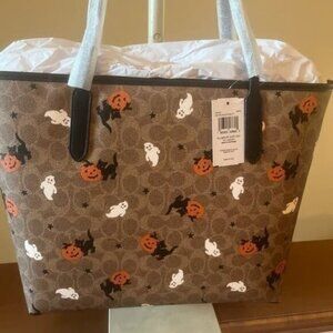 Chic Coach tote with Halloween motifs. Features playful pumpkins, ghosts, and cats. Perfect for festive outings.