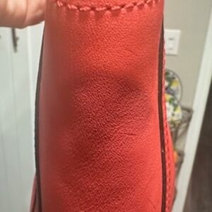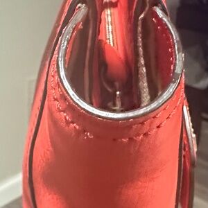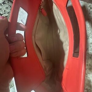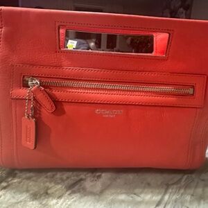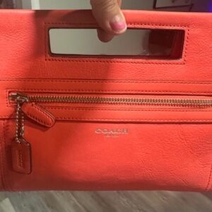 Coach Coral Colored Clutch Purse is a stylish and elegant accessory for women. The rectangular shape, zip closure, and gold hardware give it a sleek and sophisticated look, perfect for a clutch occasion. The coral exterior color and orange wrist strap add a pop of color to your outfit. The purse features inner pockets for organization and is made of leather with a fabric lining in beige. The Coach Kristin model from the Coach Factory line showcases the brand's craftsmanship and attention to detail.