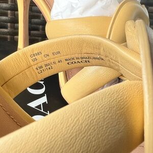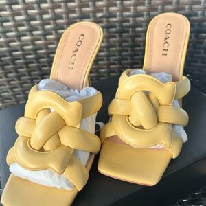 Elevate your style with these Coach heels, featuring a striking braided design in a vibrant yellow hue. The minimalist square toe and sleek silhouette make them a modern choice for any occasion. Crafted with attention to detail, these shoes are a perfect blend of elegance and contemporary fashion. new with box