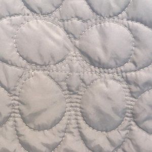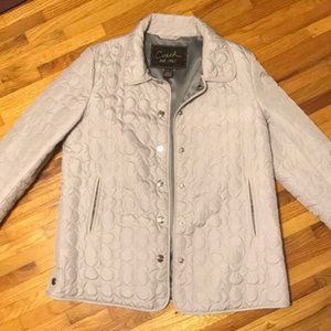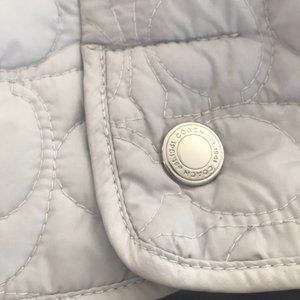 Brand new, never worn, no tags. Coach signature monogram C quilted embroidered button up lightweight puffer jacket. Fully lined, snap closures with engraved Coach insignia, side slit pockets on either side. Color is a light silvery gray off white color with a silvery lining. Perfect all weather barn style jacket. Great barn coat style. Size L. G10.