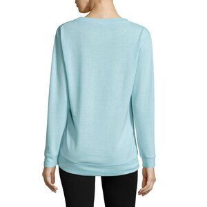 Brand new with tags, officially licensed women's juniors size graphic pullover sweatshirt in lightweight pale blue fabric that's smooth on the inside and softly brushed on the outside to feel like fleece, featuring banded waist and cuffs and an image on the chest of two polar bears sharing a bottle of Coke and a hug like the classic Christmas holiday commercials, and the script Coca-Cola logo above in red.