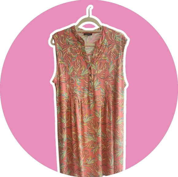 Comfy summer dress, tropical print dress, stretchy airy dress, peach green yellow dress, lightweight casual dress, flowy summer outfit, vacation beach dress, easy breezy dress, sleeveless midi dress, chic resort wear, boho summer dress, trendy tropical fashion, casual sundress, breathable fabric dress, soft stretch dress