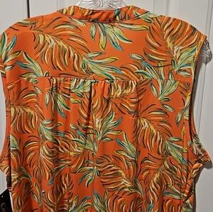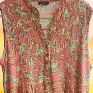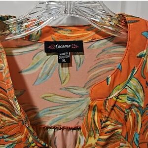 Light, stretchy, and airy with a beautiful tropical print in peach, green, and yellow.