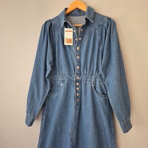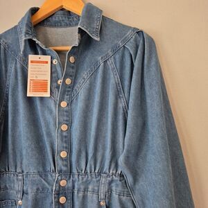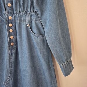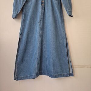 Blue denim long sleeve button up maxi dress from New Collection. Puffy sleeves. 2 front and 2 back pockets. Belt loops. Elastic waist. Side slits on both sides. New with tags.