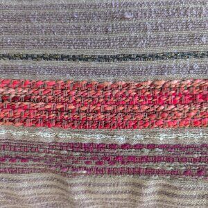 New Collectioneighteen woven shawl/wrap in varying thread weights in taupe, muted orange and red and a few threads of gold and white. This item has 1" lightweight taupe fringe on both ends and measures 36 1/2" long and 23" wide. Beautiful, soft piece that can be worn in numerous ways.