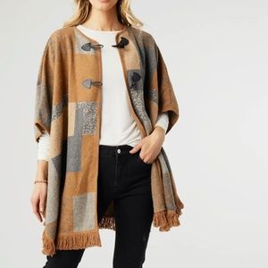 Stay cozy and stylish with our Ruana! Featuring a playful colorblock design and charming fringe accents, this topper is perfect for any occasion. Also features a convenient toggle clasp closure. Snuggle up and make a statement!