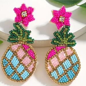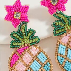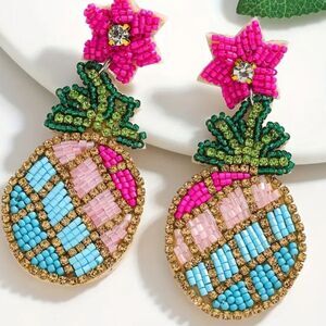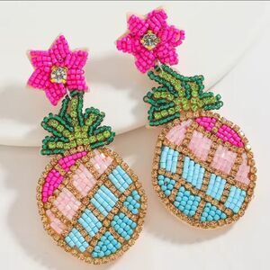 Add a pop of color to your outfit with these vibrant beaded pineapple earrings. Featuring a playful mix of pink, blue, green, and gold beads, these earrings are perfect for any occasion.