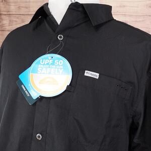 Features: Omni-Shade UPF 50 sun protection; Omni-Wick moisture-wicking; short sleeve; button front; vented back with mesh lining; chest pocket with loop; embroidered Columbia logo at chest; PFG reflective triangle patch at back; sleeve hit reads "OMNI-SHADE."