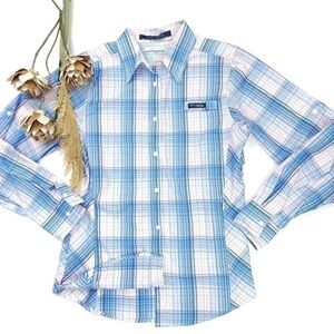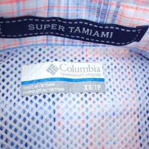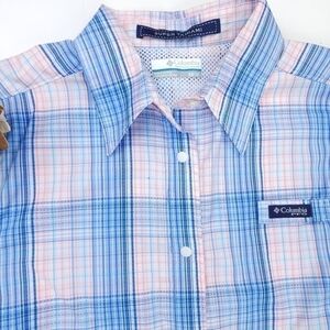 Columbia Super Tamiami Blue Pink Plaid Omni Shield Hidden Pockets Shirt Xs
