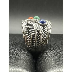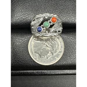 New Condition Coral Turquoise Lapis Feathers Band Ring 925 Size 7