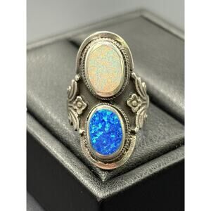 New Condition Sterling Silver Blue White Lab Opal Double Ring Size 7