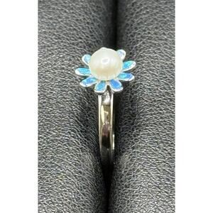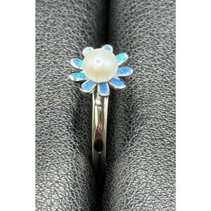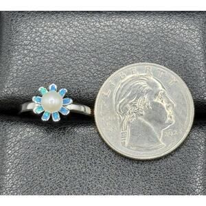 New Condition Sterling Silver Genuine Pearl Lab Opal Flower Ring Size 7.00