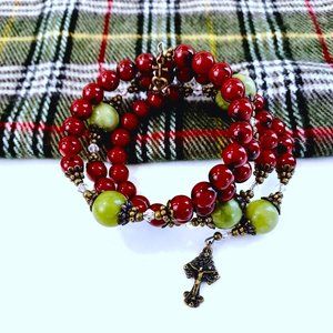 Genuine Connemara Marble beads with red glass bead accent - Brass Cross (faith) and Anchor (hope) charms at ends- Coil style wire