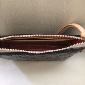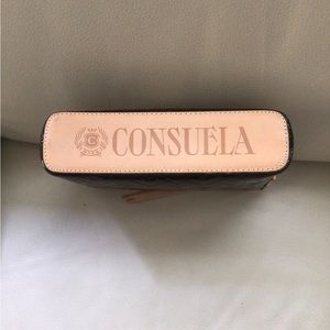 Conseula glossy black crossed-stitched exterior with interior pocket and credit card pocket. Trimmed in natural leather it measures 9”w x 6.5”h x 2.5” at bottom.