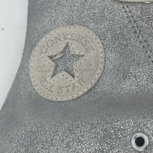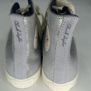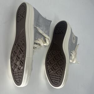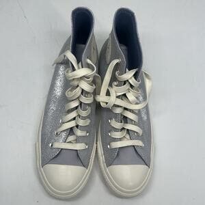 Stylish metallic gray high-top sneakers with cream accents. Features a classic design.