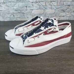 TheSoloist. takes Jack Purcell’s classic low rise Converse sneaker and gives it an Americana-inspired update. Repurposing the US flag, the uppers and tongue are finished in blue and white stars and red stripes, while the traditional white twill laces are eschewed for a chunky black zip closure.