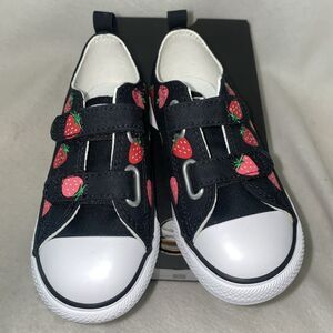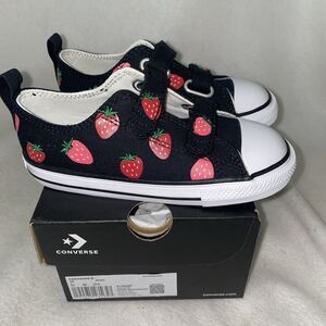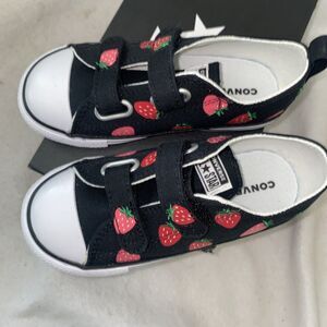 Brand new super cute must have converse All-Star Chuck Taylor, low top hook and loop black shoe sneakers with a super cute with strawberry all over pattern with green embroidery for the stem